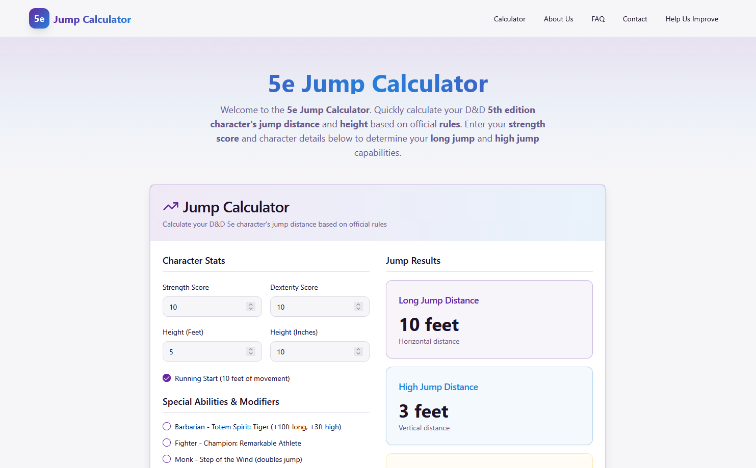Thanks for visiting 5e Jump Calculator, a small online tool created to fix a common D&D 5e table slowdown: jumping.